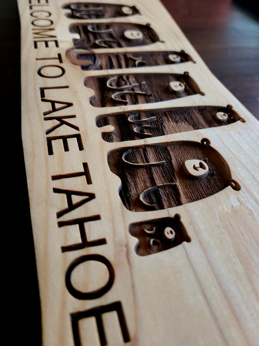 Cute Bears Engraved Rustic Wood Welcome to Lake Tahoe Sign
