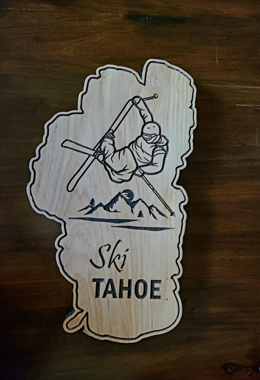 Lake Shaped Engraved Ski Tahoe Wood Rustic Cutout Sign